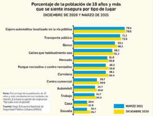 En marzo pasado, 83.9 por ciento de las mujeres manifestó sentirse insegura en los cajeros automáticos localizados en la vía pública, 76.1 por ciento en el transporte público y 22.8 por ciento en casa; respectivamente en estos mismos lugares 63.4 por ciento, 65.1 y 17.6 por ciento de los hombres dijeron sentirse inseguros.
