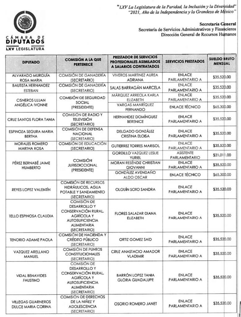 Además, les paga a otros dos prestadores de servicios: Leslie Yuriel Gordillo Vázquez, como asistente parlamentario con un salario de 21 mil 11 pesos mensuales brutos.