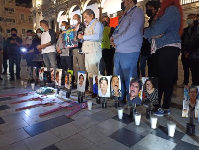 En la protesta apostada en el zócalo frente al Palacio Municipal, se colocaron imágenes de los periodistas asesinados con cruces fúnebres y veladoras, diseñado por el artista y periodista Jorge González.