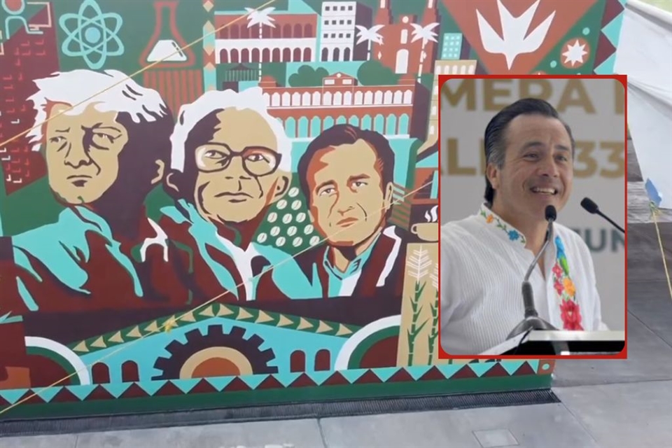 El gobernador Cuitláhuac García Jiménez compartió imágenes de un mural en el que fue pintado junto con el presidente Andrés Manuel López Obrador y el secretario de Educación Zenyazen Escobar.