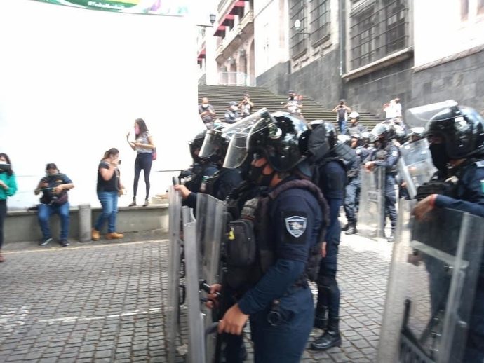 Xalapa, Ver.- La tarde de este lunes, más de 200 elementos de Seguridad Pública fueron desplegados en el centro de esta capital para contener a la marcha feminista en el marco del día latinoamericano por un aborto legal y seguro.
