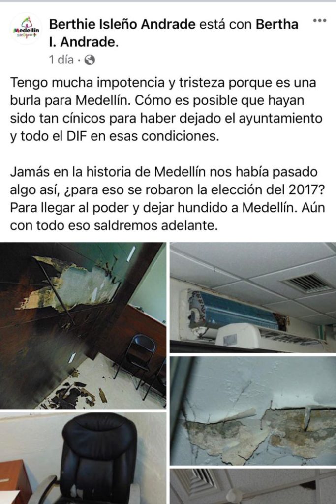 Lo anterior se pudo constatar a través de las redes sociales de la presidenta del DIF de Medellín, Bertha Isleño Andrade, quien lanzó una fuerte crítica al gobierno saliente al compartir las imágenes de las condiciones deplorables en las que se encuentran las instalaciones del DIF y el Palacio Municipal, entre otros edificios.