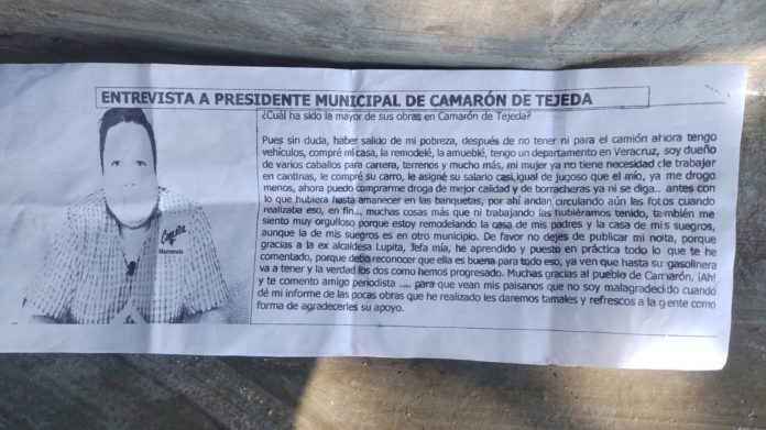 Días antes del Primer Informe de labores del alcalde de Camarón de Tejeda, Uriel González Alarcón; ciudadanos del municipio, molestos y hartos por los pocos o nulos beneficios prometidos durante su campaña, regalaron volantes publicitarios qué exhiben presunta corrupción de su parte.