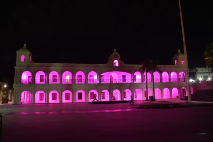 Boca del Río, Ver., 19 de octubre de 2021.- El presidente municipal de Boca del Río, Humberto Alonso Morelli acompañado por su esposa Karla Robles de Alonso en apoyo a las mujeres que padecen o vencieron el cáncer de mama realizaron por cuarto año el encendido rosa del palacio municipal.
