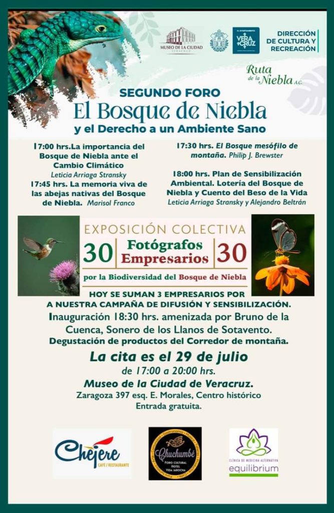 Veracruz, Ver., 28 de julio de 2022.- Ruta de la Niebla A.C., presentará mañana a las 17:00 horas en el Museo de la Ciudad, el Segundo Foro El Bosque de Niebla y el Derecho a un Ambiente Sano, para dar paso a las 18:30 horas a la inauguración de la Exposición Colectiva 30 Fotógrafos y 30 Empresarios por la Biodiversidad del Bosque de Niebla.