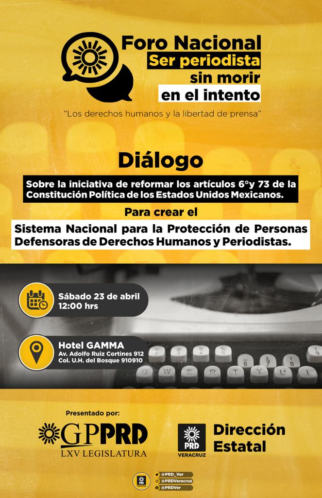 Este evento se realizará el próximo sábado 23 de abril en el Hotel Gamma en la ciudad de Xalapa, Veracruz, en punto de las 12 horas; donde se hablará sobre la Iniciativa para reformar los artículos 6° y 73 de la Constitución Política de los Estados Unidos Mexicanos, con el fin de crear el Sistema Nacional para la Protección de Personas Defensoras de los Derechos Humanos y Periodistas.