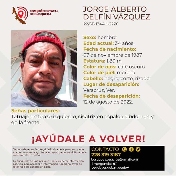 La Comisión Estatal de Búsqueda de Veracruz reportó la desaparición de dos hombres en el puerto de Veracruz. Uno de ellos es Jorge Alberto Delfín Vázquez, cuyas características son: tez morena, ojos color café oscuro y cabello negro, corto y rizado.