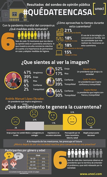 En el sondeo de opinión realizado por UNOCI Consultores en comunicación al cuestionar sobre ¿Qué sentimiento te genera la cuarentena? donde 51 por ciento de los participantes respondió que preocupación por su futuro (económico, laboral y de salud), un 27 por ciento dijo sentir miedo por contagiarse, un 17 por ciento impotencia a no encontrar soluciones, el 4 por ciento alegría porque puede descansar y 2 por ciento enojo por el cambio de vida.