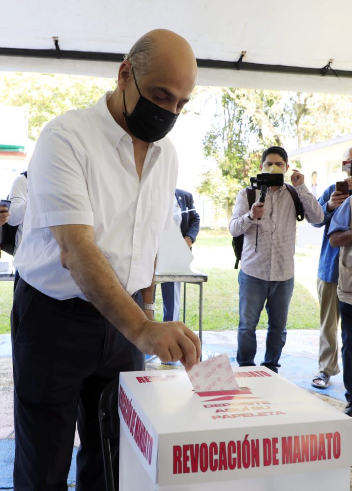 Xalapa, Ver., 10 de abril de 2022.- La consulta de revocación de mandato es una oportunidad histórica para evaluar a los gobernantes y contribuir a que cada vez se tengan mejores autoridades que sirvan a la sociedad y no se sirvan del cargo, afirmó el presidente municipal Ricardo Ahued Bardahuil tras emitir su voto este domingo en la casilla instalada en el fraccionamiento Las Ánimas.