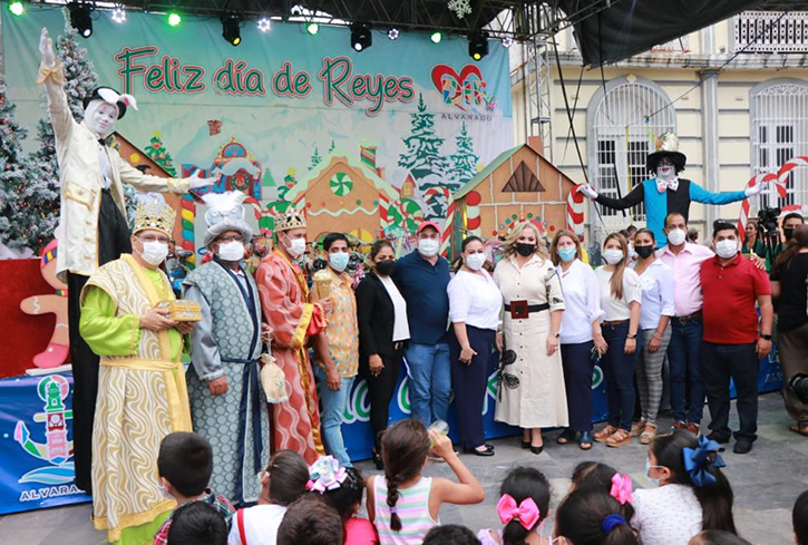 Alvarado, Ver.- Con juguetes, dulces, y regalos la alcaldesa Lizzette Álvarez Vera celebró el Día de Reyes en el zócalo en medio de la concurrencia de familias que disfrutaron del evento infantil. La autoridad municipal respaldada por los ediles destacó que es el primer acto público, donde se festeja a los niños.