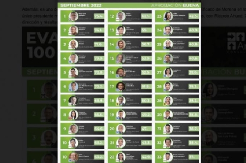 La encuesta señala que el primer lugar de la lista es ocupado por César Garza Villarreal de Apodaca, Nuevo León con el 75.4% de aprobación seguido de Armando Martínez Manríquez de Altamira, Tamaulipas con el 74.1%. En tanto, el tercer lugar lo ocupa el alcalde de Xalapa, Veracruz, Ricardo Ahued Bardahuil.