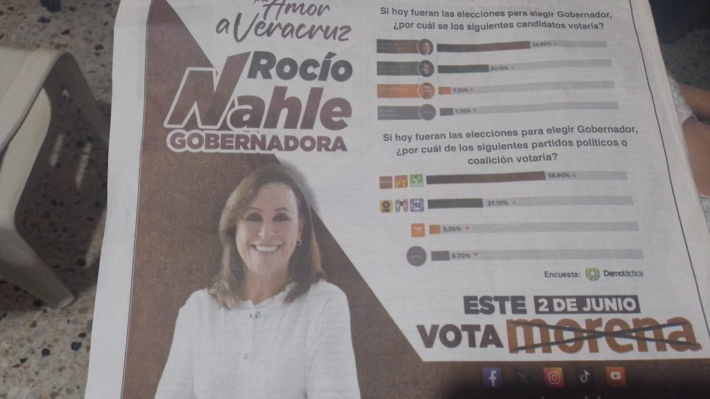 La candidata a la gubernatura de Veracruz de Morena, PVEM, PT y Fuerza por México, Rocío Nahle García difundió a través de los medios de comunicación una encuesta en la que resulta ganadora.