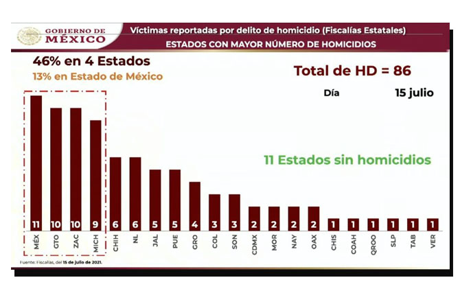 En la revisión de datos estadísticos sobre homicidio doloso por entidad federativa, durante el periodo comprendido entre enero-mayo de 2021, el presidente destacó a Veracruz como una de las entidades en las que se ha presentado una reducción en víctimas de este delito.