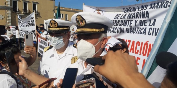 Marinos mercantes de Veracruz se manifestaron esta mañana frente a las instalaciones de la Primera Región Naval de la Secretaría de Marina-Armada de México, en contra de las reformas que se discuten en el Senado de la República, de lo que ellos consideran la “militarización” del sector.