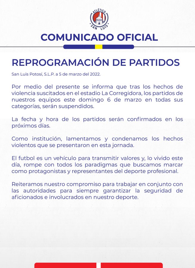 De esta manera, los partidos programados para este domingo han quedado suspendidos y tendrán que ser reprogramados, en fechas y horarios aún por definirse.