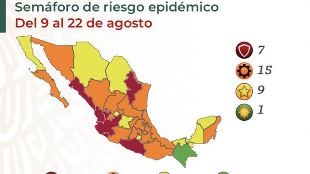 En el reporte de la SSa, se indica que a partir del siguiente lunes 9 de agosto y hasta el siguiente domingo 22 del mismo mes, serán 7 los Estados que se coloquen en semáforo rojo.