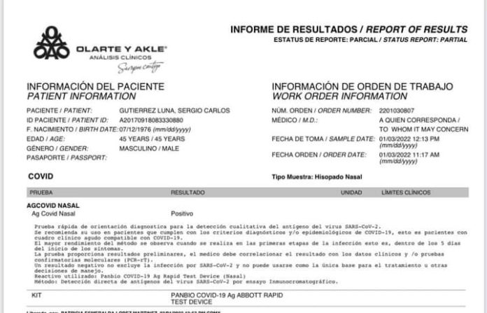En su tuit, el presidente de la Cámara de Diputados compartió una fotografía en la que se muestra la prueba de diagnóstico y el resultado positivo para Covid-19 de la misma. “Anoche empezamos a sentir algunas molestias de resfriado leve Diana y yo. Nos hicimos la prueba y salí positivo de Covid. Hasta el momento nos sentimos bien, estaremos en reposo y pendientes de todo a distancia”: Sergio Gutiérrez Luna.
