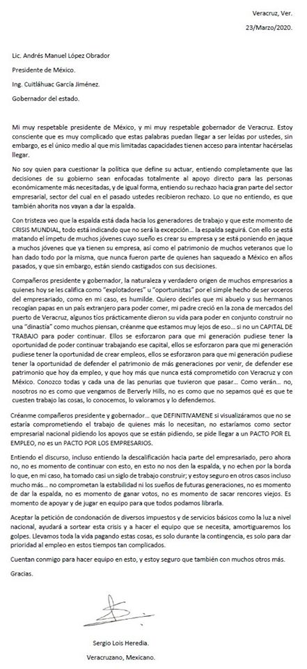 Después de que el presidente de la República, Andrés Manuel López Obrador anunció en la conferencia mañanera de este lunes que no apoyará a los empresarios con condonación de impuestos ni apoyos de ningún tipo para que enfrenten las pérdidas económicas que les provoca la pandemia del coronavirus, el presidente de la Comisión de Turismo en Coparmex, Sergio Lois Heredia decidió escribirles una carta al presidente de la República y al gobernador de Veracruz, Cuitláhuac García Jiménez.