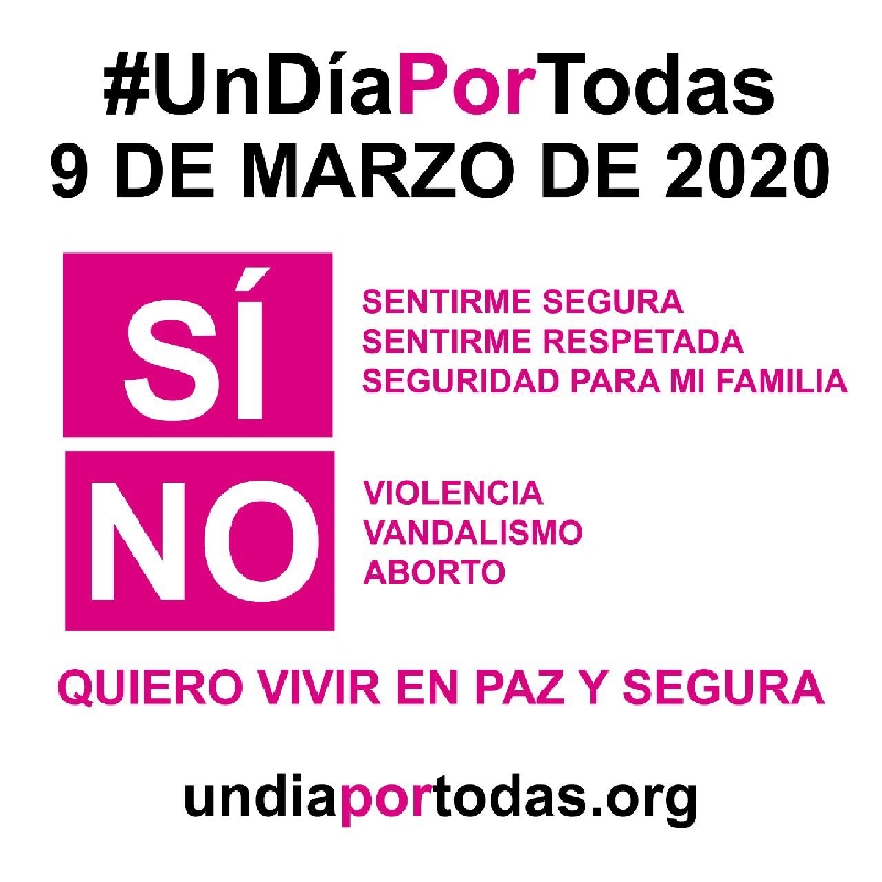 La campaña “Un día por todas” es una iniciativa que responde a la inquietud social generada por los hechos violentos contra las mujeres que han tomado especial relevancia recientemente en nuestro país. Son mujeres que quieren decir fuerte y claro “sí” a una exigencia de seguridad y de respeto para todas, pero igualmente confirman su “no” a la violencia, el vandalismo y el aborto.