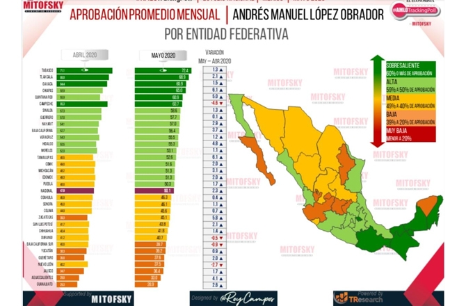 Ciudad de México.- De acuerdo a la encuesta de aprobación promedio mensual elaborada por consulta Mitofsky la aprobación del presidente Andrés Manuel López Obrador en el estado de Veracruz aumentó 1.2 por ciento al pasar de 54.3 por ciento en el mes de abril a 55.5 por ciento en mayo.