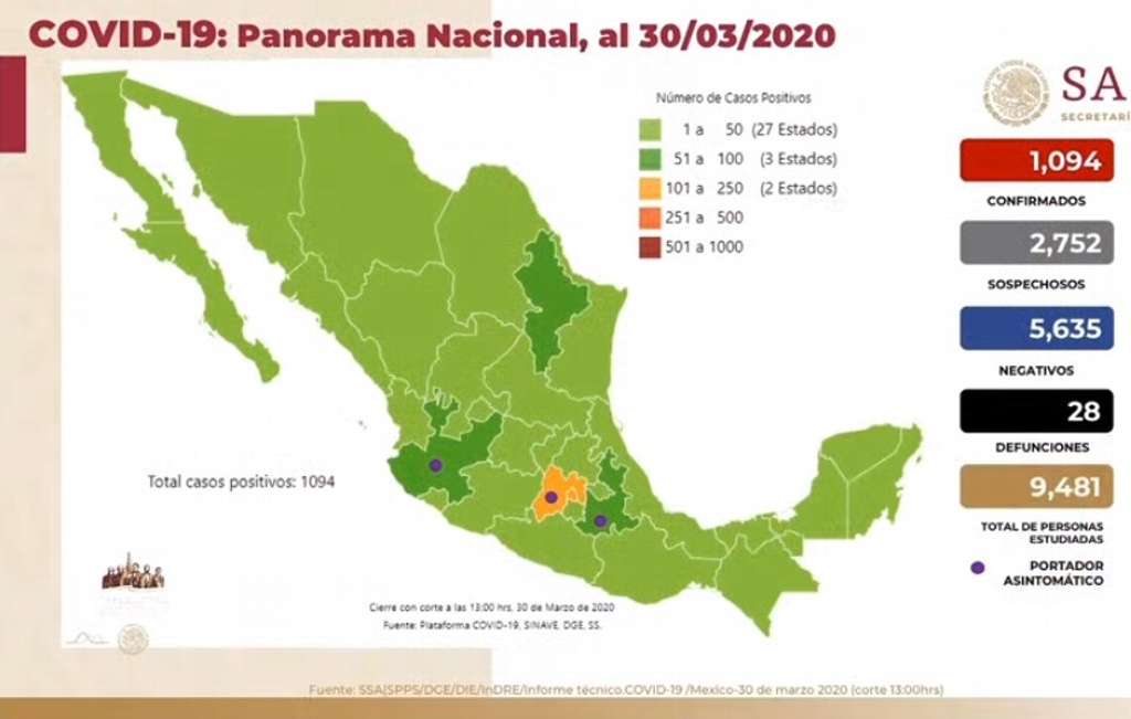 La Secretaría de Salud federal dio a conocer este lunes que ya suman 28 muertes por Covid-19 en México. Añadió que hay 1,094 casos confirmados de coronavirus en el país, así como 2 mil 752 casos sospechosos.