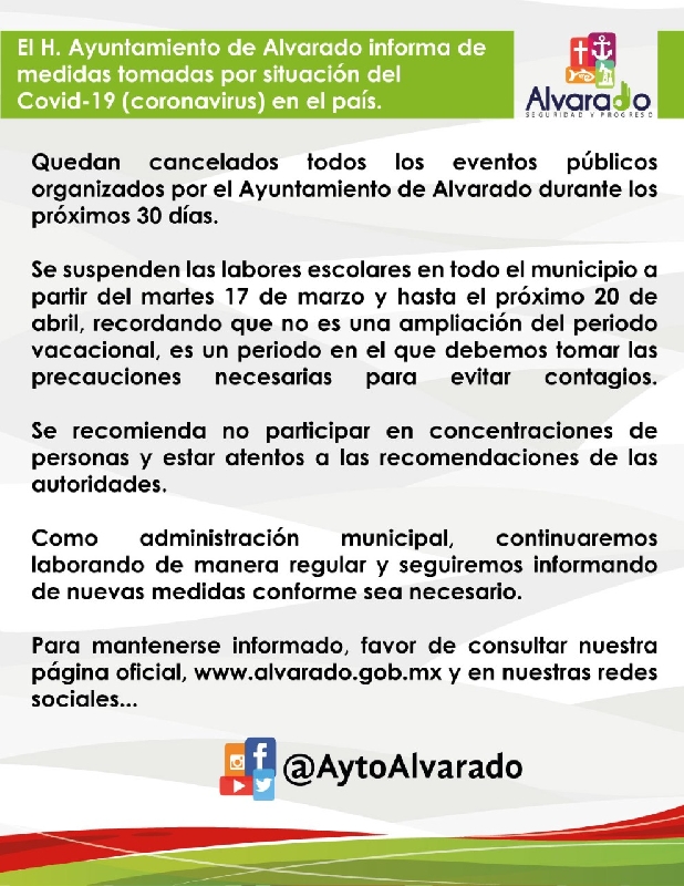 * El H. Ayuntamiento de Alvarado informa de medidas tomadas por situación del Covid-19 (coronavirus) en el país