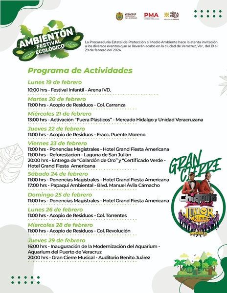 Señaló que dentro de las actividades programadas se contemplan acciones de reforestación, un festival infantil, un papaqui ambiental y por el acopio de residuos de manejo especial, con esta última las personas podrán canjear sus desechos por uno de los 5 mil boletos para el gran concierto de cierre del Ambientón que estará a cargo de Junior Klan y Chiquito Team Band en el auditorio Benito Juárez el 29 de febrero.