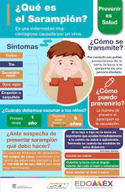 El virus del sarampión es uno de los más contagiosos, se transmite por contacto directo con gotitas de saliva y moco expulsadas cuando la persona infectada tose, estornuda o habla, y los casos son más frecuentes durante los primeros cuatro meses de cada año (final del invierno e inicio de la primavera). La enfermedad se caracteriza por un cuadro inicial parecido al de un catarro con fiebre, tos, estornudos, lagrimeo y congestión nasal, a lo que sigue unos días después la aparición de ronchas rojas pequeñas en la piel. El tiempo entre el contagio y la aparición de los síntomas es de entre siete a 21 días (promedio 10), y la persona infectada puede contagiar a otros desde cuatro días antes hasta cuatro días después de tener las lesiones en la piel, las cuales pueden durar de cuatro a siete días y posteriormente ocurre descamación. Las complicaciones ocurren más frecuentemente en niños menores de 6 años y en personas inmunocomprometidas. Los efectos se pueden presentar en oídos, laringe y pulmones, y aunque poco frecuente también aparece daño cerebral.