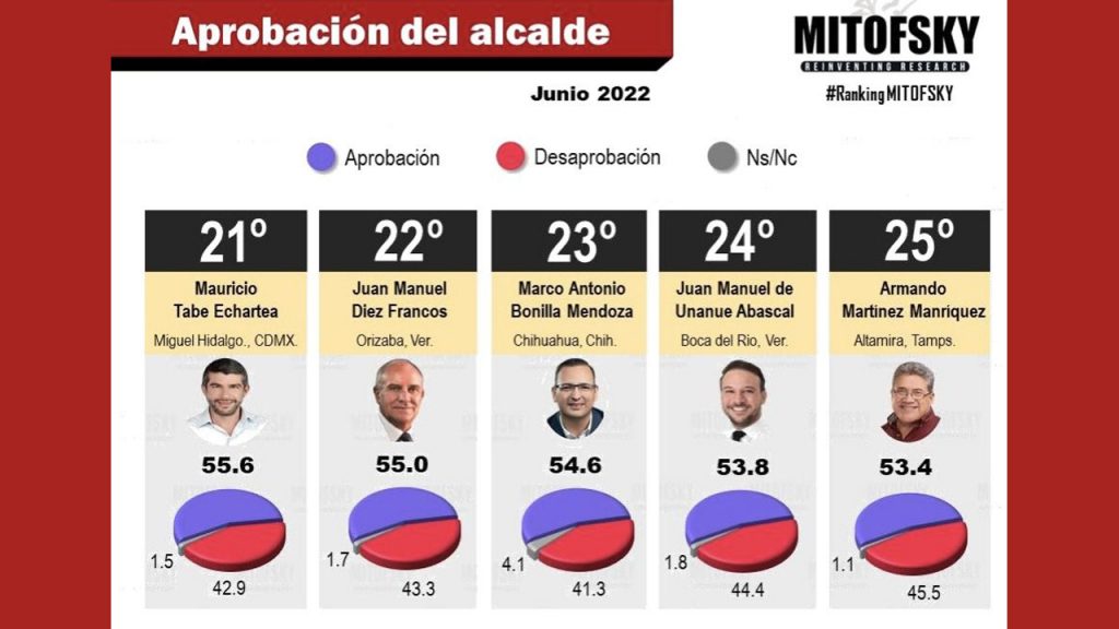 Ciudad de México.- Boca del Río por primera vez se encuentra en el “Ranking Mitofsky alcaldes de México”. La empresa Consulta Mitofsky, una de las encuestadoras de mayor prestigio en el país enlistó a Juan Manuel Unánue, como el primer presidente municipal de ese lugar mejor evaluado.