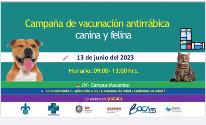 Boca del Río, Ver., 12 de junio de 2023.- La Universidad Veracruzana (UV) en la región Veracruz, a través de la Facultad de Veterinaria y Zootecnia (FMVZ)en coordinación con la Secretaría de Salud de Veracruz (SESVER) y los ayuntamientos de Veracruz y Boca del Río, realizará jornadas gratuitas de vacunación antirrábica canina y felina, del 13 al 15 de junio.