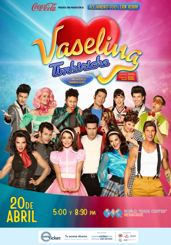 La obra de teatro musical “Vaselina” se presentará en el World Trade Center del municipio de Boca del Río este sábado 20 de abril con dos funciones programadas a las 5:00 y 8:30 pm. El elenco de Vaselina compartirá créditos con los cantantes de Timbricihe y otros solistas que han logrado hacer una carrera musical en este país. “Vaselina” llega con su espectáculo de música, baile y risas.