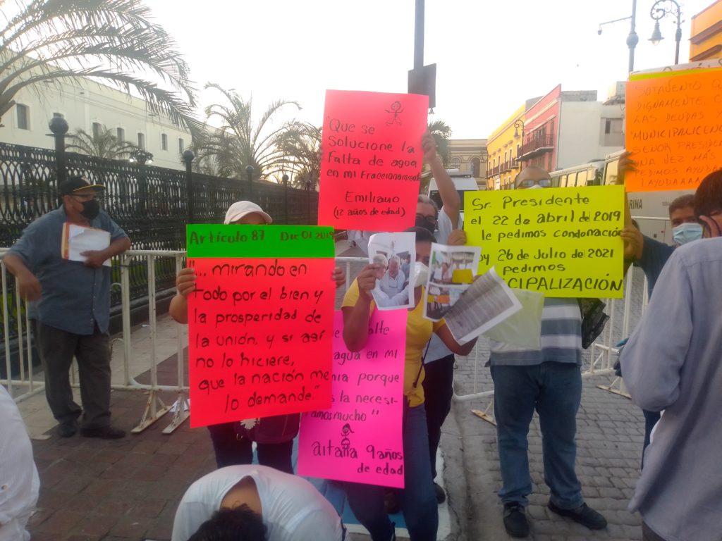Habitantes de los fraccionamientos Hacienda Sotavento, Bonaterra y Pueblo Nuevo acudieron a unos metros del Museo Naval de Veracruz, donde se realizó la conferencia mañanera del presidente Andrés Manuel López Obrador para pedirle la condonación del adeudo ante CFE y Conagua, así como la condonación de créditos hipotecarios y la municipalización de los tres fraccionamientos.