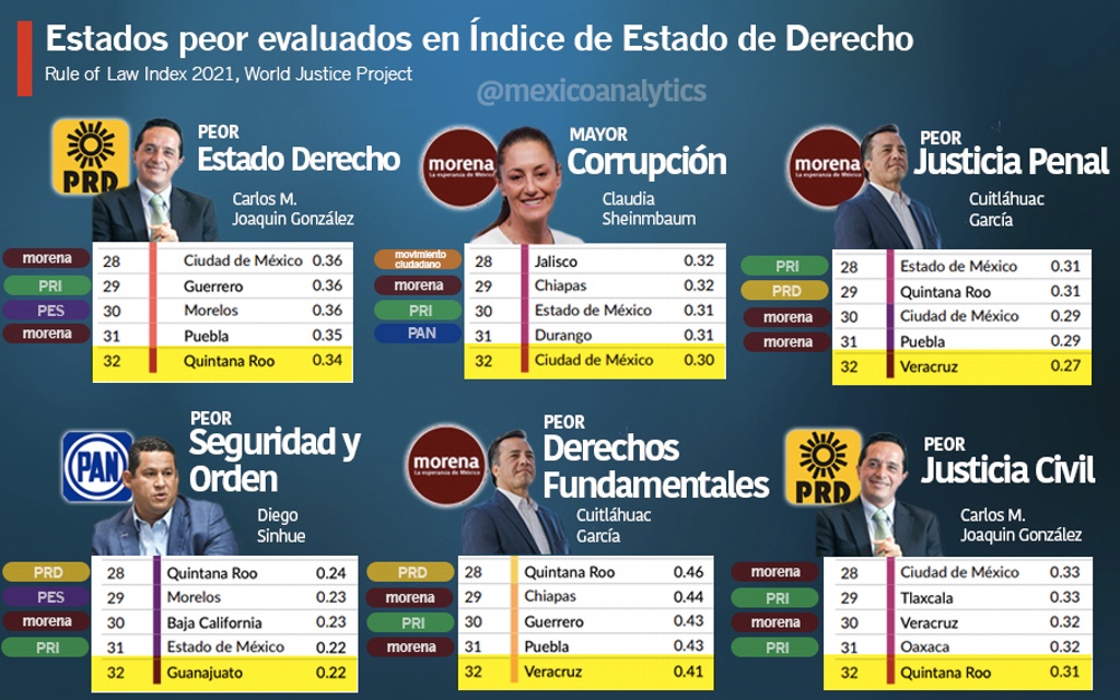 De acuerdo con la encuesta, el Estado de Veracruz está en el último lugar en el factor de límites al gobierno, derechos fundamentales y justicia penal, lo que hace que la entidad tenga una adhesión más débil al Estado de Derecho.