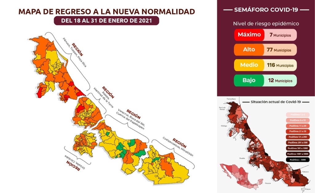 La Secretaría de Salud del Estado de Veracruz presentó la noche de este sábado el semáforo estatal de riesgo de Covid-19 correspondiente al periodo del 18 al 31 de enero de 2021.