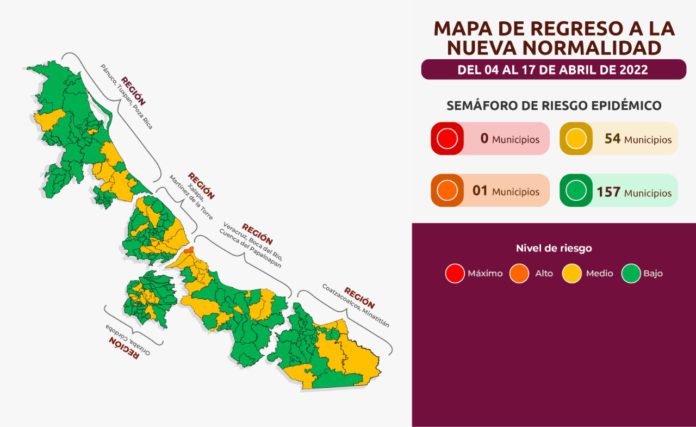 En el *Semáforo de Riesgo Epidémico* nacional, vigente del 04 al 17 de abril, Veracruz permanecerá en color verde. A nivel estatal, Úrsulo Galván es el único municipio en naranja (riesgo alto), 54 ocuparán el amarillo (riesgo medio) y 157 el verde (riesgo bajo).