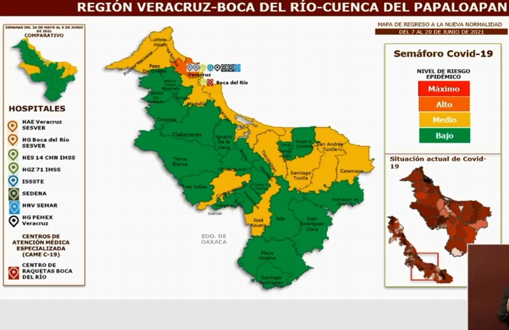 De acuerdo con el semáforo estatal de riesgo de Covid-19 correspondiente al periodo del 07 al 20 de junio de 2021 presentado por la Secretaría de Salud, los municipios de Boca del Río, Medellín y Alvarado fueron ubicados en color amarillo o riesgo medio; mientras que Veracruz retrocedió a riesgo alto o naranja.
