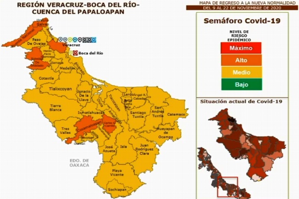 El semáforo estatal de riesgo de Covid-19 correspondiente al periodo del 9 al 22 de noviembre presentado el viernes 6 de noviembre por la Secretaría de Salud, indica que los municipios de Boca del Río, Medellín y Alvarado pasan a amarillo en el semáforo estatal de riesgo de Covid-19, mientras que el municipio de Veracruz continúa en color naranja.